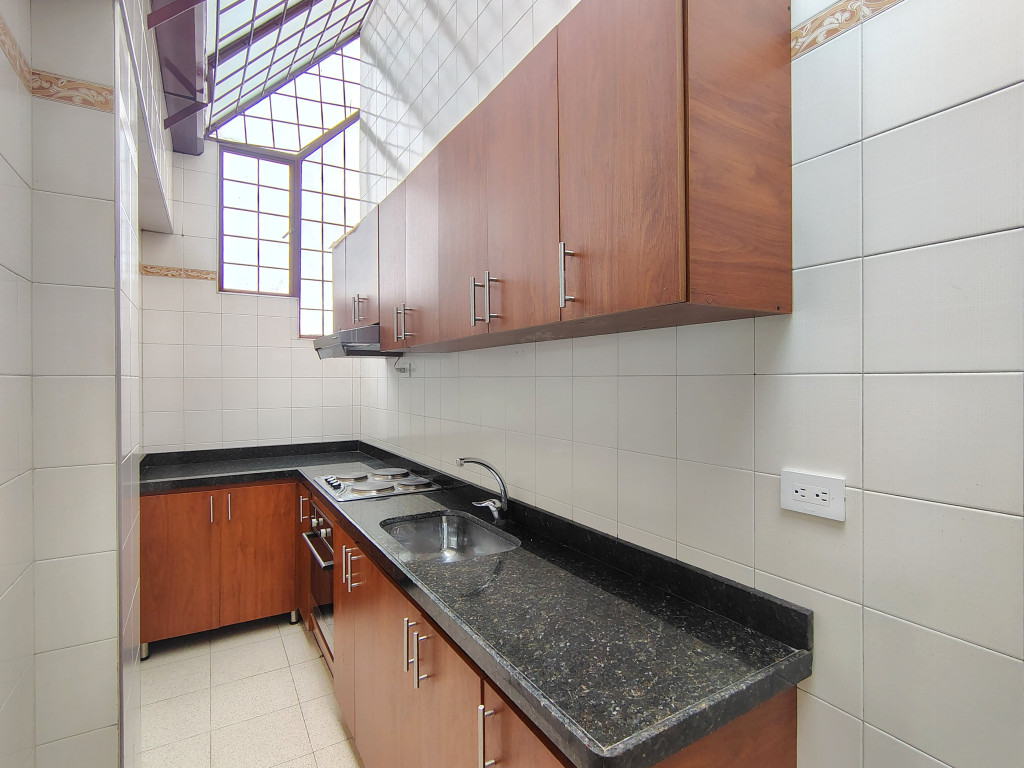 Apartamento de 65 M2, de vista interior con buena iluminación natural, ubicado en Quinto piso, cuenta con sala comedor y pisos en cerámica, tres alcobas con closet, pisos laminados, dos baños, cocina integral eléctrica y garaje cubierto. El conjunto cuenta con salón social, parque infantil, vigilancia 24/7, ascensor y CCTV. Cerca a Avenida Calle 7, Universidad Libre y Presidencia de la Republica.